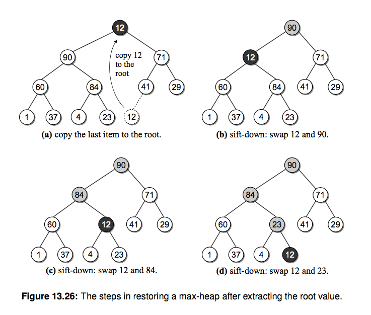 - 获取并移除根节点的值。每次我们都可以获取最大值或者最小值。这个时候需要把底层最右边的节点值替换到 root 节点之后 执行 sift-down 操作。